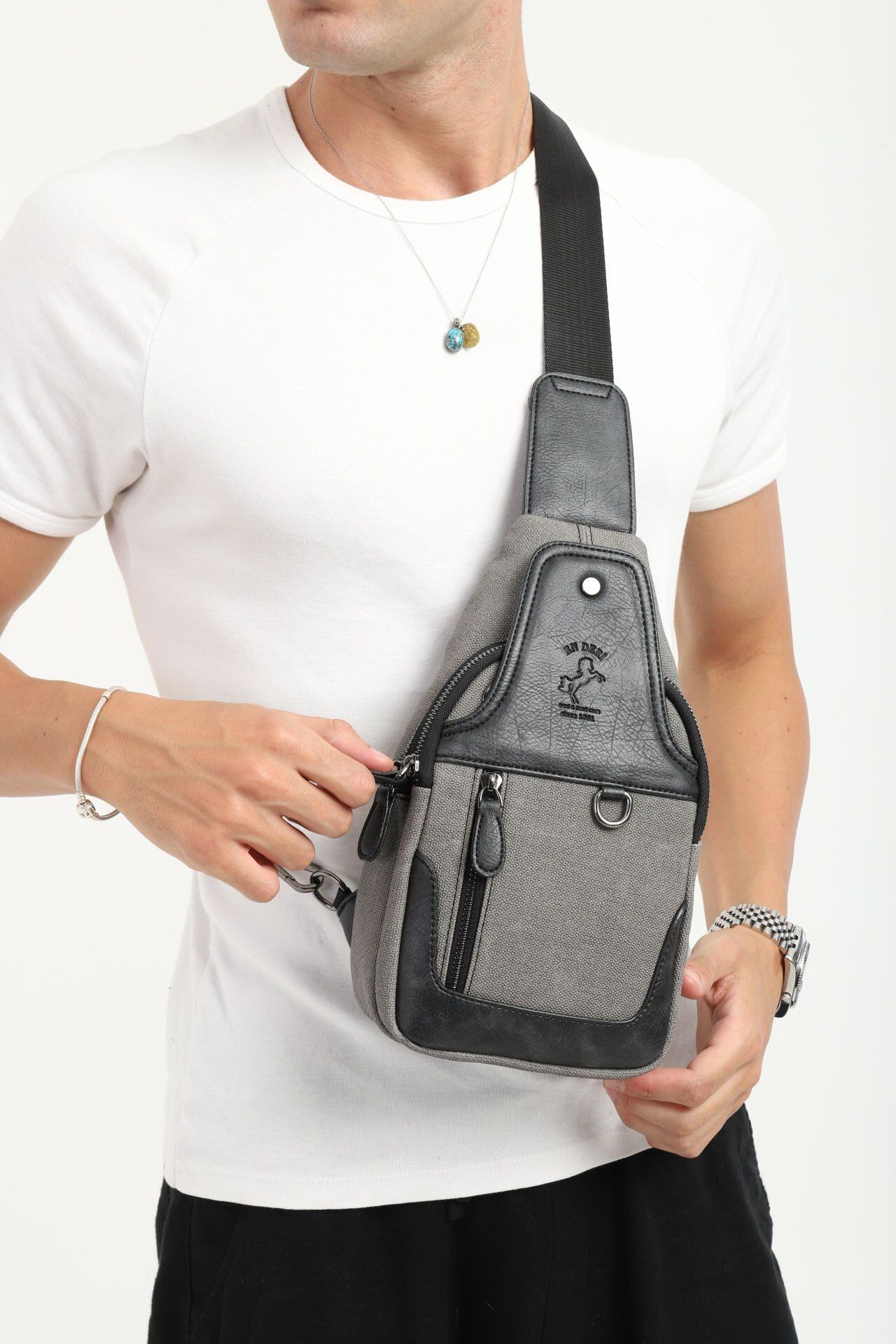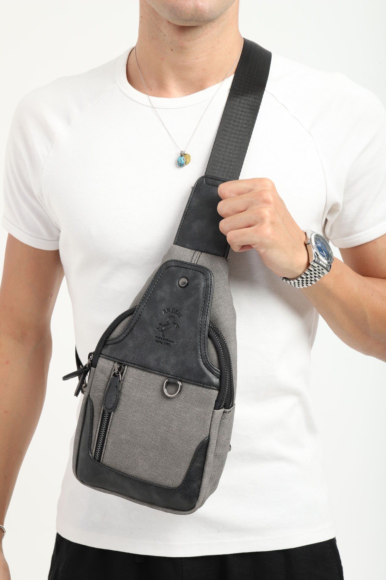 Erkek antrasit renk çapraz askılı çanta, modern görünümü ve çok bölmeli fonksiyonel yapısıyla günlük yaşam için mükemmel bir tercihtir. Dayanıklı kanvas kumaşı uzun ömürlü kullanım sağlar. Göğüs ve omuz kullanımına uygun ergonomisi sayesinde gün boyu rahat bir taşıma deneyimi sunar.