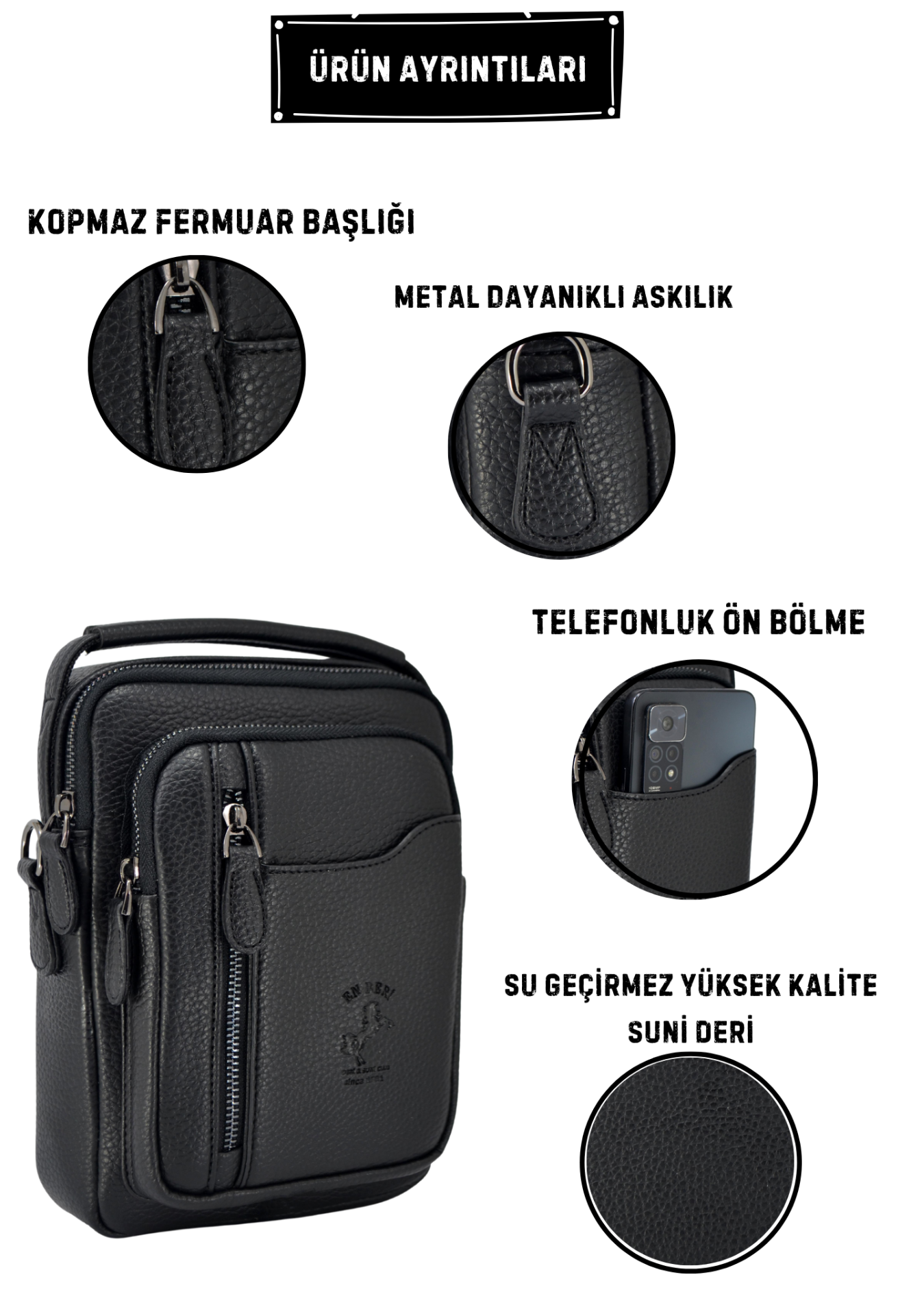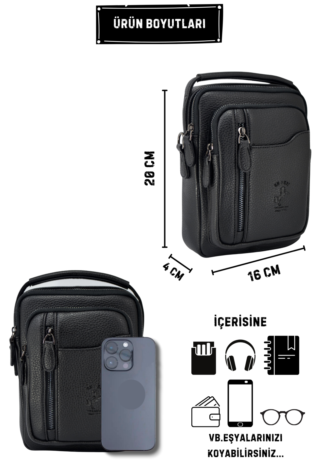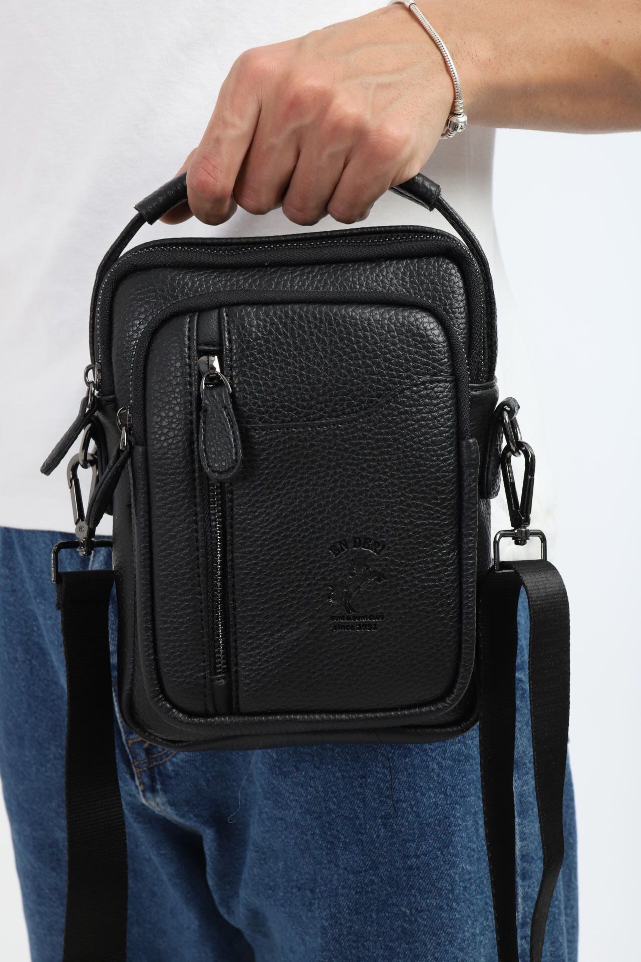 En Deri tarafından üretilen bu siyah erkek el ve omuz çantası, şıklık ve fonksiyonelliği bir arada sunan modern bir modeldir. Suni deri materyali, çok bölmeli yapısı ve ergonomik tasarımıyla günlük kullanımda pratiklik sağlar. Erkek çapraz çanta, erkek omuz çantası ve erkek postacı çanta olarak kullanılabilir.
