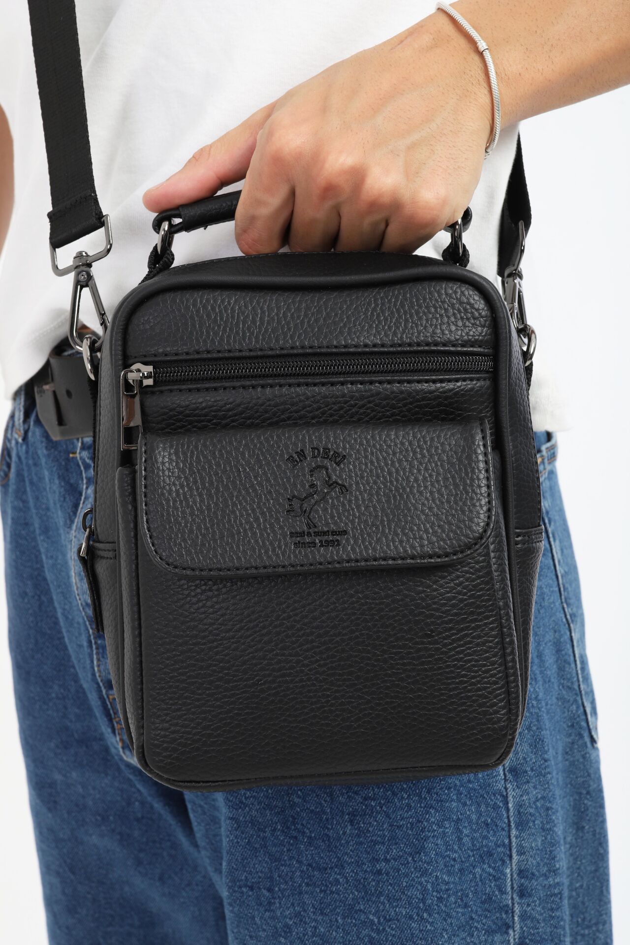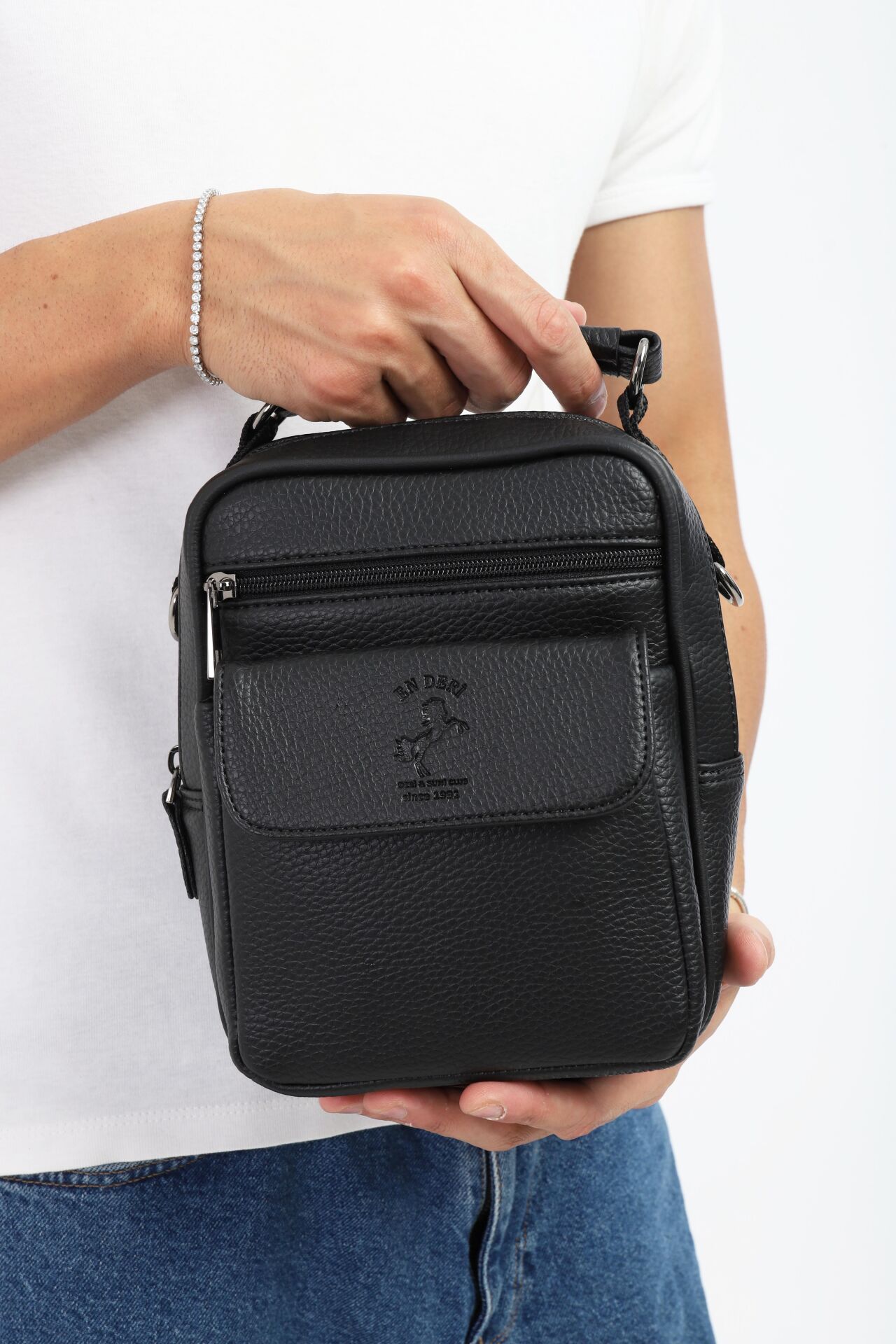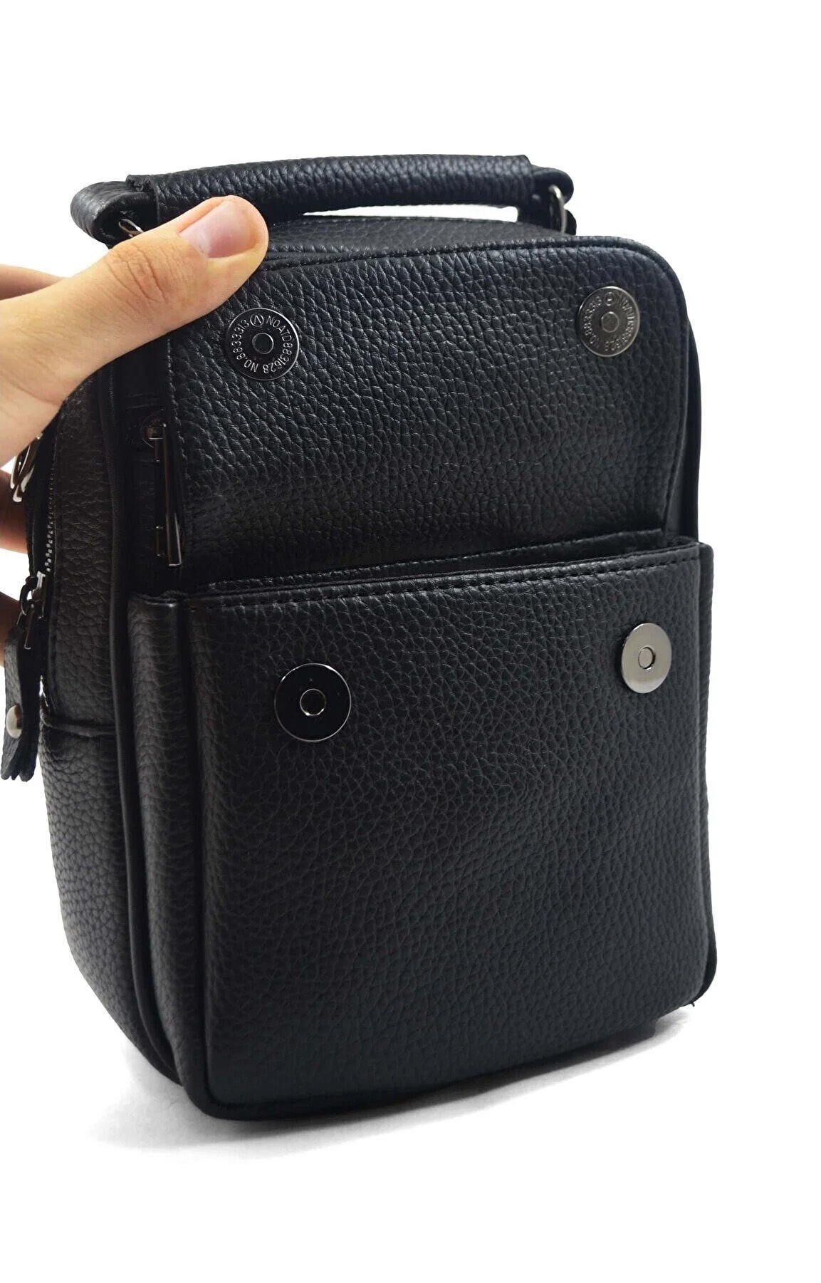 En Deri tarafından üretilen bu siyah erkek el ve omuz çantası, modern şehir yaşamının ihtiyaçlarına göre tasarlanmış şık ve fonksiyonel bir modeldir. Suni deri yapısı, ayarlanabilir askısı ve çok bölmeli düzeni sayesinde hem erkek omuz çantası hem de erkek çapraz çanta olarak kullanılabilir. Erkek postacı çanta formuyla da günlük kullanımda büyük pratiklik sağlar.