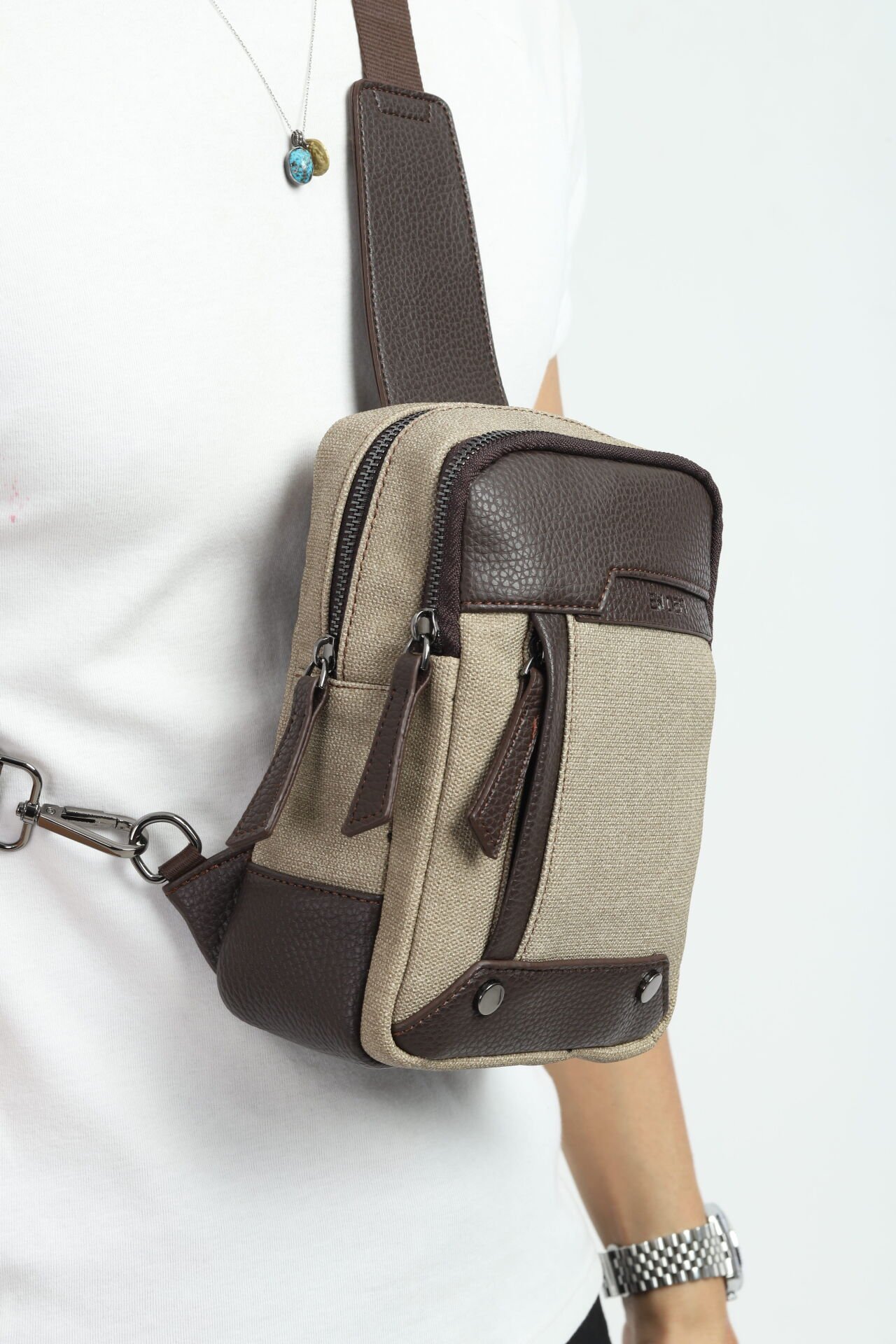 Kahverengi Kanvas Omuz Çantası - Erkek Çok Bölmeli Organizer Çapraz Çanta